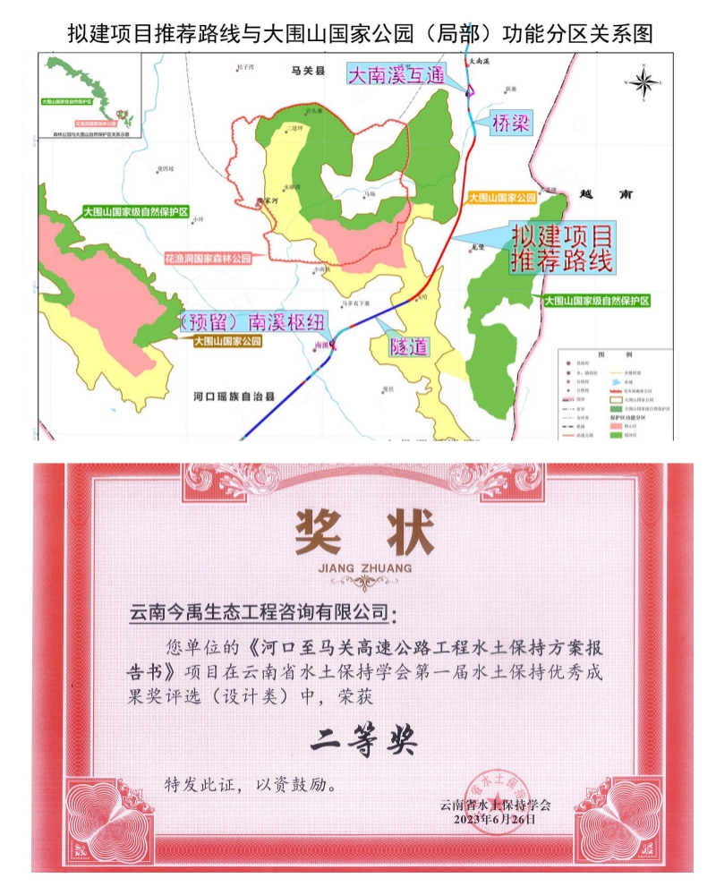 該項(xiàng)目存在以下技術(shù)難點(diǎn):①項(xiàng)目屬于沿邊高速,線(xiàn)路走向限制因素和敏感因素較多,其中經(jīng)過(guò)云南大圍山國(guó)家級(jí)自然保護(hù)區(qū)、河口南溪河水生野生動(dòng)物州級(jí)自然保護(hù)區(qū)、南溪河風(fēng)景名勝區(qū)、馬關(guān)縣古林箐省級(jí)自然保護(hù)區(qū),占用永久基本農(nóng)田、生態(tài)保護(hù)紅線(xiàn)、公益林等范圍。②項(xiàng)目橋隧比高,產(chǎn)生棄渣量較大,由于沿線(xiàn)限制及敏感因素問(wèn)題,棄渣場(chǎng)選址困難,為了避讓沿線(xiàn)限制及敏感因素,棄渣場(chǎng)選址經(jīng)過(guò)多次優(yōu)化,多次復(fù)核,多次與相關(guān)管理部門(mén)協(xié)調(diào)溝通,最終選定52個(gè)棄渣場(chǎng)。③由于項(xiàng)目水保方案編制時(shí)主體設(shè)計(jì)已到初設(shè)階段,建設(shè)單位將項(xiàng)目以州界劃分為兩個(gè)標(biāo)段,分別委托兩家公司承擔(dān)兩個(gè)標(biāo)段的初步設(shè)計(jì)工作,主體設(shè)計(jì)分為兩部分,在水保方案編制過(guò)程中增加了數(shù)據(jù)統(tǒng)計(jì)量、項(xiàng)目溝通和手續(xù)辦理等方面的工作量,但為后期變更、監(jiān)測(cè)和驗(yàn)收數(shù)據(jù)對(duì)比節(jié)省了較大的工作量。
